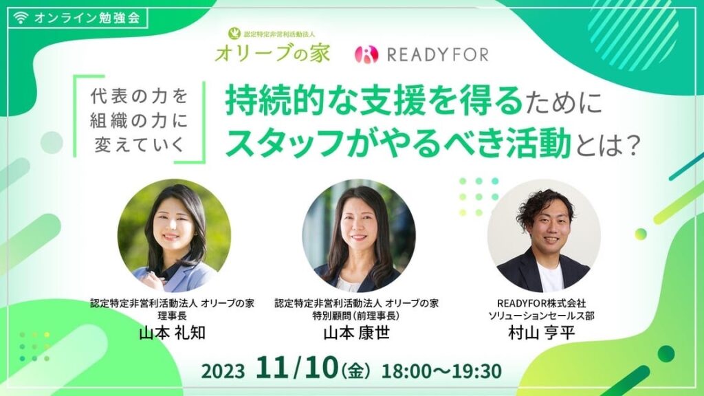 READYFOR 主催のオンライン勉強会にこの度新理事長の山本礼知と特別顧問(前理事長)の山本康世の2名が登壇いたします。